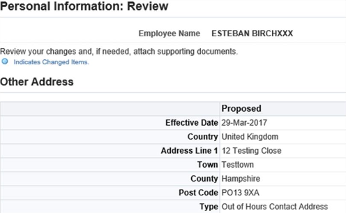 The Personal Information: Review screen will be displayed and show the fields in which changes have been made. This is indicated by a small blue dot icon.