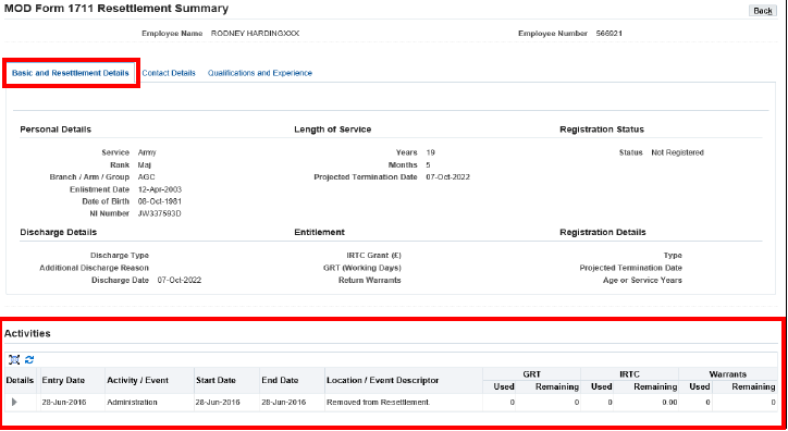 Any Resettlement activities that take place throughout your Resettlement period can be viewed in the activities box at the bottom of the screen. It is also helpful for keeping a check on how much Graduated Resettlement Time (GRT) you have taken, Individual Resettlement Training Costs (IRTC) spent and the remaining number of warrants available to you.