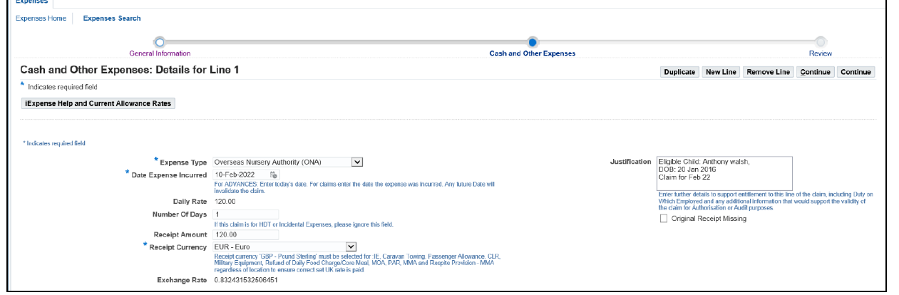 select Overseas Nursery Authority (ONA) or Universal Infant Free School Meal (UIFSM) from the Expense Type drop down box (dependant on claim being made)