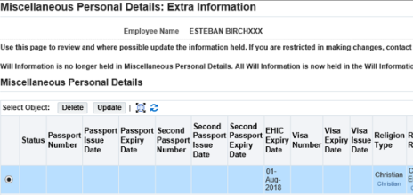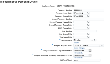The Miscellaneous Personal Details screen will be displayed allowing you to make changes to your details. Please note that the Passport Number and Second Passport Number fields should only contain numerical values and should not be used to record any other information such as "No Passport Held".