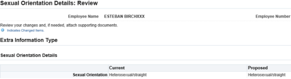- this screen will show either no information (if you have not recorded any declaration), or a row of information indicating your current Sexual Orientation Declaration