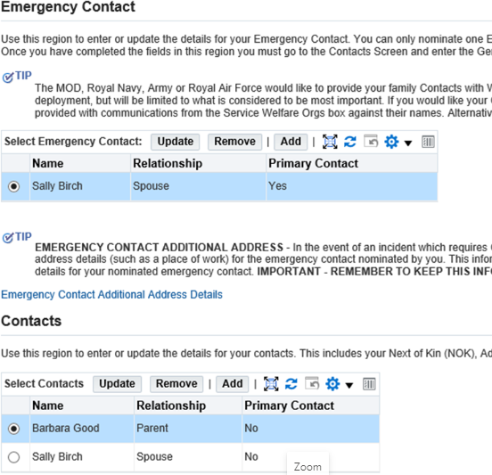 - select the radio button next to the contact you wish to make you next of kin and select update