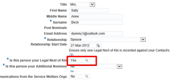 - ensure that you state that the contact is your Legal Next of Kin by entering Yes in the appropriate field